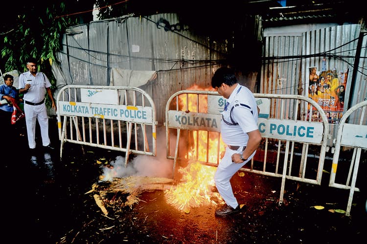 जादवपुर में सड़क पर जलते टायर को बुझाने में पुलिसकर्मी का पैर जला