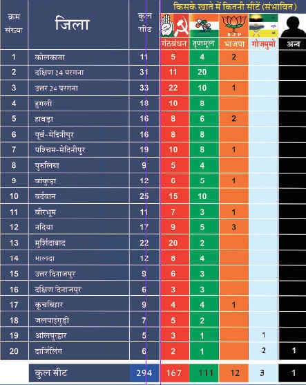 लेकिन साथ ही यह भी कहा गया है कि 294 में से 25 सीटों पर तृणमूल कांग्रेस के जीत का अंतर सिर्फ पांच प्रतिशत का होगा. इसलिए इन 25 सीटों पर उलटफेर भी हो सकता है. तृणमूल कांग्रेस अगर इन 25 सीटों पर बहुमत नहीं हासिल कर पाती है तो वह सत्ता में नहीं बना पायेगी और तृणमूल की कुल सीटें कम होकर 138 रह जायेंगी और यह सभी सीटें अगर वामो-कांग्रेस गंठबंधन की ओर जाते हैं तो उनके सीटों की संख्या कुल मिला कर 151 हो जायेगी.