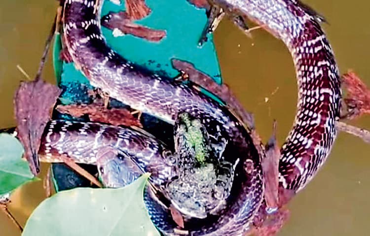 मेढक उसके सिर पर विराजमान था. मालूम हो कि घाटाल के कई इलाके पानी की चपेट में हैं. सड़कें पानी में डूबकर तालाब में तब्दील हो गयी हैं. वहीं इलाके में सांपों का आतंक भी काफी बढ़ गया है. इलाके में पानी के तेज बहाव की चपेट में आकर एक साथ पानी के साथ बह रहा था. इससे भी हैरतअंगेज बात यह थी कि जो सांप पानी के साथ बह रहा था, उसके सिर पर एक मेढक बैठा हुआ था. जो सांप मेढक का दुश्मन होता है, उसे पकड़ कर खा जाता है. शिकार सांप के सिर पर बैठा था और सांप उसके प्राण लेने के बजाय उसके प्राणों की रक्षा करते हुए उसे पानी में डूबने से बचा रहा था. पानी के तेज बहाव के साथ सांप एक झाड़ियों में फंस गया. स्थानीय लोगों ने सांप के बारे में वन विभाग को जानकारी दी. वन कर्मियों ने सांप को रेस्क्यू किया और मेढक को सुरक्षित स्थान पर छोड़कर सांप को वन कार्यालय लेकर गये.