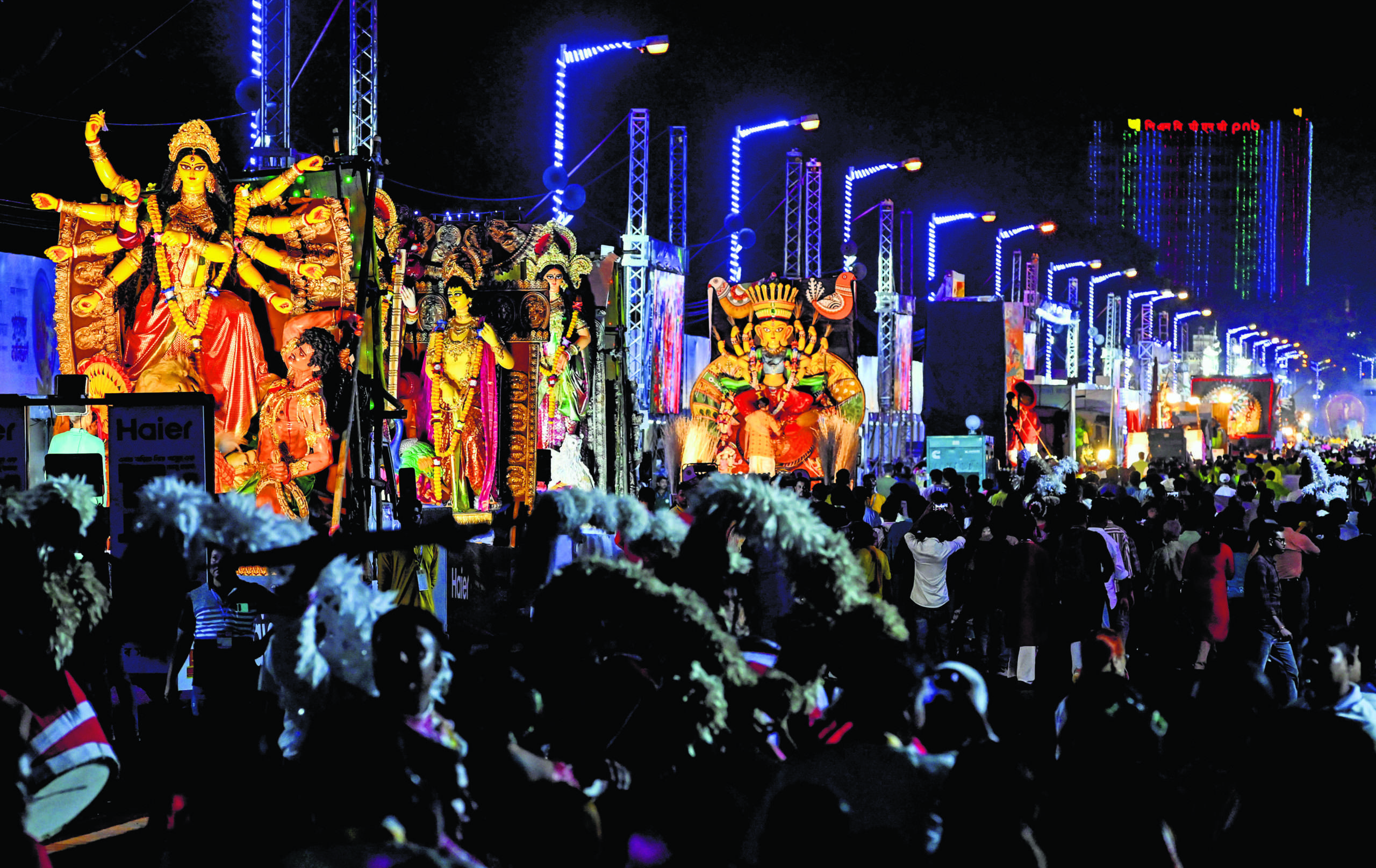 कोलकाता. रविवार को रेड रोड पर आयोजित दुर्गापूजा कार्निवल में बंगाल की संस्कृति और कला का अद्भुत नजारा देखने को मिला. मां दुर्गा का नयनाभिराम दर्शन हुआ. मुख्यमंत्री ममता बनर्जी अपने वरिष्ठ मंत्रिमंडल सहयोगियों के साथ कार्निवल में शामिल हुईं. अपराह्न 4:15 बजे ढाक की थाप के साथ कार्निवल की शुरुआत हुई. डोना गांगुली और उनके ट्रुप का प्रदर्शन दर्शकों के लिए आकर्षण का केंद्र रहा. विभिन्न पूजा समितियों की सांस्कृतिक प्रस्तुतियों के बीच मुख्यमंत्री भी खूब थिरकीं. उन्होंने मंच पर टॉलीवुड सितारों के साथ नृत्य किया और ढाक की थाप बजायी. कार्निवल में डीएल रॉय के ‘धनो धन्य पुष्पभरा आमदेर एई बोसुंधरा’, प्रतुल मुखर्जी के ‘अामी बांग्ला गान गाई’, मोनाली ठाकुर के ‘दुग्गा एलो’ और रबींद्रनाथ ठाकुर के प्रसिद्ध संगीत पर मुख्यमंत्री ने थिरकते हुए उत्सव का आनंद लिया. अभिनेत्री मीनाक्षी शेषाद्री ने मुख्यमंत्री द्वारा लिखे गये गीत पर शानदार नृत्य पेश किया. बाद में मीनाक्षी शेषाद्री और अन्य टॉलीवुड सितारों ने भी ममता के साथ झूमते हुए प्रस्तुति दी. भव्य मंच पर बंगाली फिल्म उद्योग, साहित्य और खेल जगत की हस्तियां मौजूद रहीं. 113 पूजा समितियों ने भाग लिया. रेड रोड के दोनों ओर लगभग 20,000 दर्शकों के लिए 30 विशाल स्क्रीन लगायी गयी थीं, ताकि दर्शक उत्सव का आनंद उठा सकें.