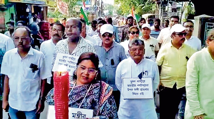 हुगली. कश्मीर के पहलगाम में पर्यटकों पर हुए भीषण आतंकी हमले के विरोध में सोमवार को चुंचुड़ा स्थित हुगली जिला न्यायालय परिसर में अधिवक्ताओं ने एक शांतिपूर्ण मौन जुलूस निकाला. इस विरोध प्रदर्शन का आयोजन हुगली जिला बार एसोसिएशन और हुगली जिला बार पुस्तकालय के संयुक्त तत्वावधान में किया गया. वकीलों ने काली पट्टी बांधकर और हाथों में मौन विरोध के संदेश लिए हुए आतंकवाद के खिलाफ एकजुटता दिखाई. .वरिष्ठ अधिवक्ताओं देवज्योति मित्रा, सुभाषिस चंदा, मृण्मय मजूमदार, सुकांत चौधरी, सब्यसाची घोष और स्वपन पाल समेत कई अन्य वकीलों ने इस मौन जुलूस में भाग लिया और मृतकों के प्रति श्रद्धांजलि अर्पित की. अधिवक्ताओं ने कहा कि देश के किसी भी कोने में नागरिकों पर हुआ हमला पूरे देश पर हमला माना जाना चाहिए और प्रत्येक नागरिक को इसके खिलाफ खड़ा होना चाहिए. मौन जुलूस अदालत परिसर से प्रारंभ होकर मुख्य द्वार तक जाकर समाप्त हुआ. इस दौरान अधिवक्ताओं ने न केवल शोक प्रकट किया, बल्कि आतंकवाद के खिलाफ समाज में जागरूकता की आवश्यकता पर भी बल दिया.तृणमूल ट्रेड यूनियन कांग्रेस का मौन जुलूस