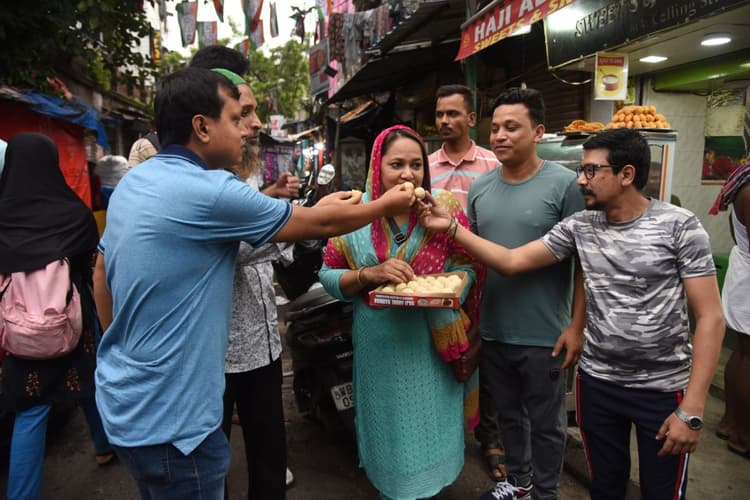 बांग्लादेश में तख्ता पलट की घटना के बाद सोमवार को कोलकाता के न्यू मार्केट में स्थित मार्कस स्ट्रीट में विभिन्न कार्यों को लेकर बांग्लादेश से कोलकाता आए बांग्लादेशी नागरिकों ने आपस में मिठाई बांटकर खुशियां मनायीं. उन्होंने देश की आजादी के नारे भी लगाए.