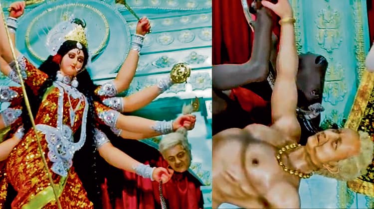 भारत के दुश्मनों को इस बार दुर्गापूजा में असुर का दर्जा दिया गया है. इस बार पूजा मंडप में महिषासुर की जगह बांग्लादेश की अंतरिम सरकार के मुखिया मोहम्मद यूनुस और पाकिस्तान के प्रधानमंत्री शाहबाज शरीफ राक्षस की भूमिका में नजर आये. यह मंडप मुर्शिदाबाद जिले के बरहमपुर में बनाया गया है. भारत पर भारी टैरिफ लगाने के कारण अमेरिकी राष्ट्रपति डोनाल्ड ट्रंप को भी असुर बनाया गया है.