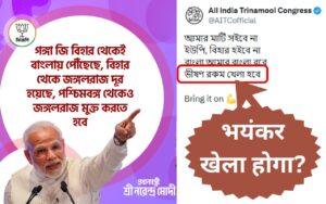 शनिवार को प्रधानमंत्री ने कोलकाता के दमदम एयरपोर्ट से नदिया की जनसभा को संबोधित किया था. इस अवसर पर उन्होंने कहा था कि गंगाजी बिहार से ही बांग्ला पहुंचती है. बिहार से जंगलराज को भाजपा ने दूर किया है. पश्चिम बंगाल को भी जंगलराज से मुक्त करना होगा. भाजपा ने मोदी के इस बयान को सोशल मीडिया एक्स पर पोस्ट किया, तो जवाब में तृणमूल ने ये बातें कहीं.