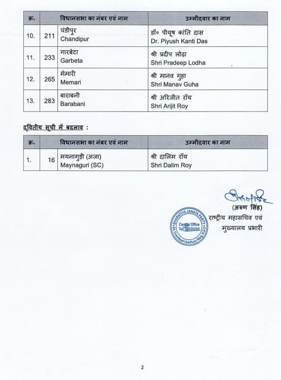 Bengal Election: पश्चिम बंगाल विधानसभा चुनाव के लिए भाजपा ने मंगलवार को 13 सीटों के लिए उम्मीदवारों के नामों की घोषणा की. 6 और सीटों के लिए उम्मीदवारों के नामों की घोषणा अभी बाकी है.