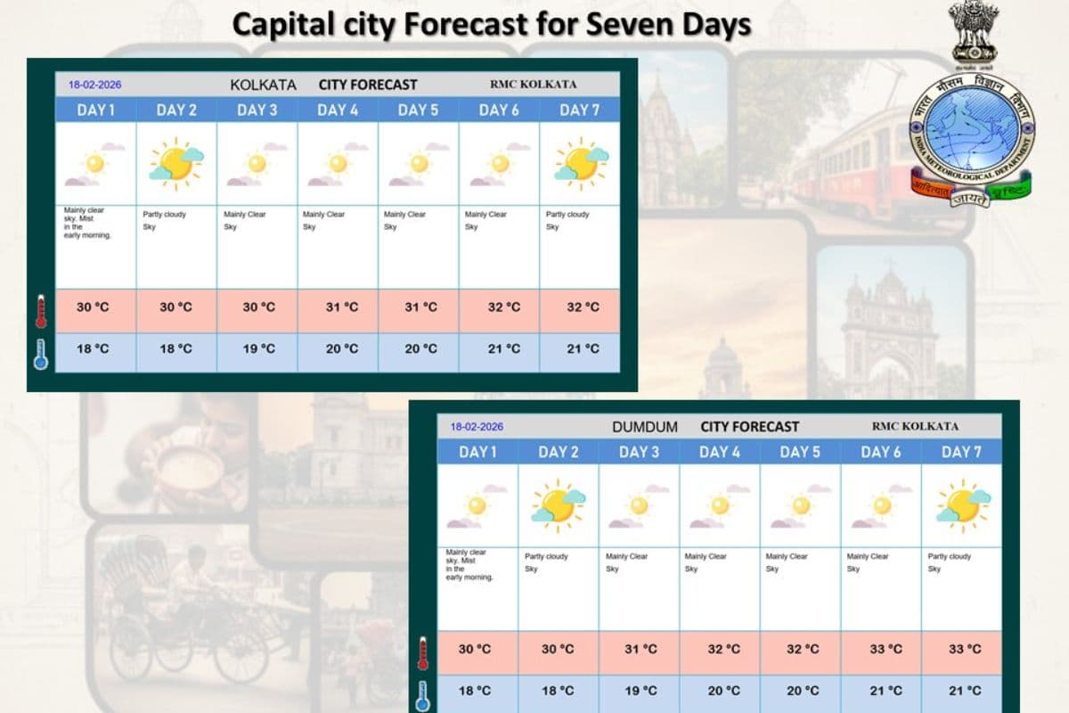 क्षेत्रीय मौसम कार्यालय ने बताया है कि अगले 7 दिन में कोलकाता के उच्चतम तापमान में 1 से 2 डिग्री की वृद्धि हो सकती है. न्यूनतम तापमान में 3 डिग्री सेंटीग्रेड तक वृद्धि होने का अनुमान है. वहीं, दमदम में उच्चतम तापमान 30 से 33 डिग्री सेंटीग्रेड और न्यूनतम तापमान 18 से 21 डिग्री सेंटीग्रेड रह सकता है.