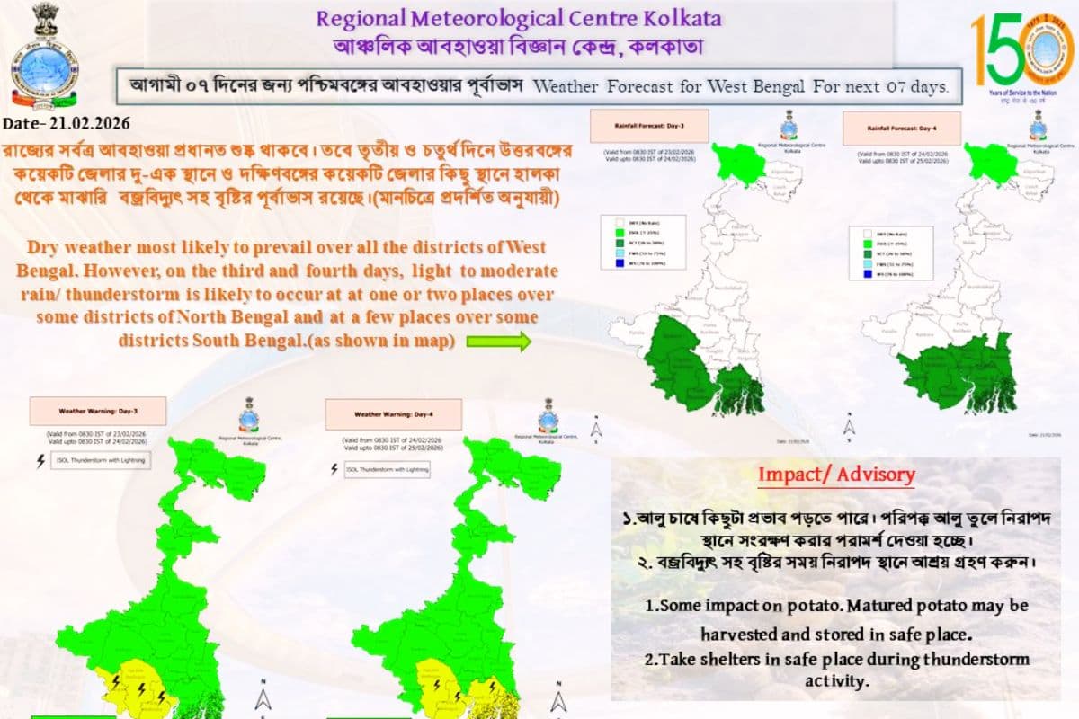 मौसम विभाग ने कहा है कि इस सप्ताह के तीसरे और चौथे दिन यानी 23-24 फरवरी को उत्तर बंगाल में कई जिलों में एक-दो जगहों के अलावा दक्षिण बंगाल के कई जिलों में कहीं-कहीं हल्के से मध्यम दर्जे की वर्षा होने की संभावना है. वर्षा के साथ वज्रपात होने की भी आशंका मौसम विभाग ने जतायी है.