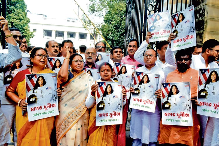 सत्र के पहले हाफ की कार्यवाही समाप्त होने के बाद भाजपा के मुख्य सचेतक शंकर घोष ने पार्टी विधायकों के समूह का नेतृत्व किया. भाजपा के करीब 30 विधायक विधानसभा के प्रवेश द्वार के पास खड़े होकर सुनीता विलियम्स को बधाई दी. प्रत्येक विधायक के हाथ में विलियम्स की एक तस्वीर थी, जिसके नीचे अभिनंदन सुनीता विलियम्स और भारतेर कन्या (भारत की बेटी) लिखा हुआ था. शंकर घोष ने कहा कि उन्होंने विधानसभा अध्यक्ष बिमान बनर्जी से अनुरोध किया है कि वे विलियम्स को बधाई देने के लिए विधानसभा को सर्वसम्मति से प्रस्ताव पारित करने की अनुमति दें.