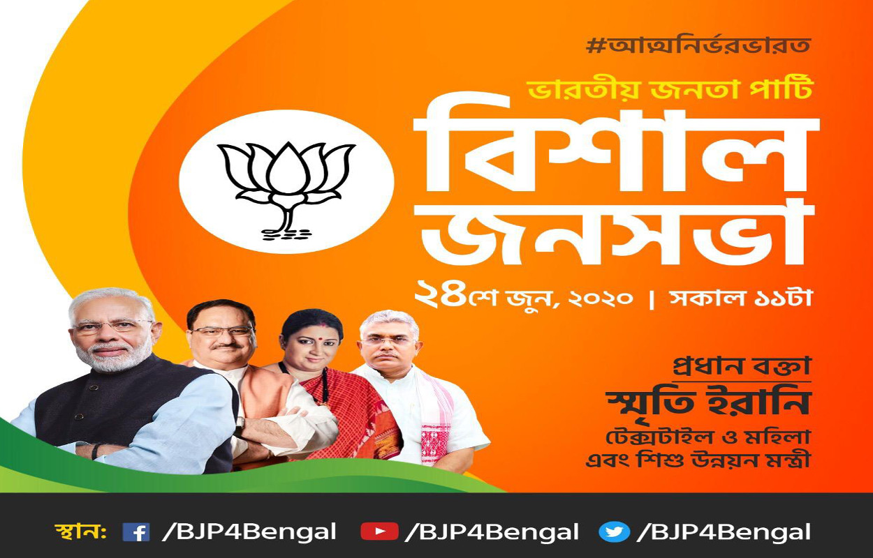 इसमें श्री शाह के बाद बंगाल की पहली वर्चुअल रैली केंद्रीय कपड़ा और महिला एवं शिशु मंत्री स्मृति इरानी 24 जून को संबोधित करेंगी. श्रीमती इरानी दिल्ली में भाजपा मुख्यालय से विर्चुअल रैली को संबोधित करेंगी, जबकि प्रदेश स्तर पर प्रदेश भाजपा के अध्यक्ष दिलीप घोष सहित अन्य पदाधिकारी उपस्थित रहेंगे. इसका प्रसारण फेसबुक, ट्विटर एवं वेबकॉम के माध्यम से किया जायेगा. बूथ व मंडल स्तर के कार्यकर्ताओं से लिंक भेजा जायेगा. सोशल मीडिया से इनका सीधा प्रसारण होगा.