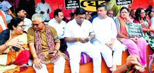 आरजी कर मेडिकल कॉलेज एंड हॉस्पिटल में जूनियर महिला डॉक्टर से दुष्कर्म व हत्या के विरोध में प्रदेश भाजपा ने बुधवार से पांच दिवसीय धरना प्रदर्शन शुरू किया. इस प्रदर्शन में प्रदेश भाजपा के नेताओं में एकजुटता देखने को मिली. मौके पर प्रदेश भाजपा अध्यक्ष डॉ सुकांत मजूमदार, विपक्ष के नेता शुभेंदु अधिकारी, पूर्व सांसद दिलीप घोष, विधायक अग्निमित्रा पॉल सहित अन्य नेता उपस्थित रहे. इस मौके पर केंद्रीय मंत्री व प्रदेश भाजपा अध्यक्ष डॉ सुकांत मजूमदार ने कानून व्यवस्था को लेकर फिर राज्य सरकार की आलोचना की है. उन्होंने मुख्यमंत्री ममता बनर्जी के इस्तीफे की मांग की. बुधवार को श्यामबाजार मेट्रो स्टेशन के गेट (1) पर धरना कार्यक्रम में सुकांत मजूमदार ने कहा : सुप्रीम कोर्ट के फैसले से पता चलता है कि कोर्ट को ममता बनर्जी की सरकार पर कोई भरोसा नहीं है और कोलकाता पुलिस कमिश्नर को तुरंत हटाया जाना चाहिए. उन्होंने कहा कि ममता सरकार के नेतृत्व में एक के बाद एक महिलाओं पर अत्याचार हो रहे हैं. इससे पता चलता है कि ममता बनर्जी का प्रशासन पर कोई नियंत्रण नहीं है, इसलिए हम उनके इस्तीफे की मांग करते हैं. श्री मजूमदार ने कहा कि मुख्यमंत्री के इस्तीफे की मांग पर भाजपा का गुरुवार को स्वास्थ्य भवन घेराव अभियान चलाया जायेगा.धरने में शामिल हुए बड़ी संख्या में भाजपा नेताओं व कार्यकर्ताओं ने ममता बनर्जी के इस्तीफे की मांग करते हुए जमकर नारेबाजी की. यह धरना पांच दिनों तक चलेगा.