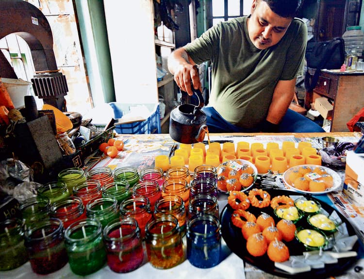 दिवाली पर महानगर में फैंसी मोमबत्तियों की मांग बढ़ने लगी है. बीके पाल एवेन्यू स्थित एक कारखाने में मिठाइयों जैसी फैंसी मोमबत्तियां तैयार की जा रही हैं. लड्डू मोमबत्ती लोगों की खास पसंद बन गयी है. कारखाने के प्रभारी तुहीन मुखर्जी ने बताया कि यह उनका पुश्तैनी कारोबार है, जिसे उनके पिता ने 1986 में शुरू किया था. अब वह इस व्यवसाय को संभाल रहे हैं. उन्हाेंने कहा कि इस बार यहां मिठाइयों की तरह दिखने वालीं फैंसी मोमबत्ती बनायी जा रही हैं. काजू बर्फी मोमबत्ती, रसमलाई मोमबत्ती, इमरती मोमबत्ती के अलावा लड्डू मोमबत्ती भी है. उन्होंने बताया कि इन मोमबत्तियों को बनाने में इम्पोर्टेड मोम का इस्तेमाल किया जाता है.