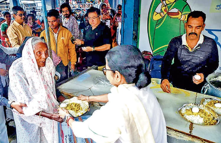 मुख्यमंत्री ममता बनर्जी बुधवार दोपहर कालीघाट स्थित से आवास से निकलने के बाद अचानक एसएसकेएम अस्पताल के सामने कार से उतर गयीं. अस्पताल के सामने मां कैंटीन के पास जाकर खड़ी हो गयीं. मुख्यमंत्री को अचानक वहां देख लोग भी हैरान रह गये. मुख्यमंत्री ने माहौल को सामान्य करने के लिए बातचीत शुरू कर दी. उन्होंने कैंटीन स्टाफ से बात की और पूछा कि आज क्या खाना परोसा जा रहा है. जवाब में कैंटीन स्टाफ ने बताया कि हर दिन की तरह आज भी चावल, दाल और करी के साथ एक उबला अंडा दिया जा रहा है. ममता ने मां कैंटीन का खाना अपने हाथों से कुछ लोगों को दिया. खाना खा रहे लोगों से उन्होंने खाने की गुणवत्ता पर बात की. कई वरिष्ठ लोगों ने खाना सौंपने के लिए मुख्यमंत्री को आशीर्वाद भी दिया. कई लोगों से वहां बातचीत करने के बाद वह फिर अपने कार्यक्रम के लिए निकल गयीं. गौरतलब है कि तीसरी बार राज्य की मुख्यमंत्री बनने के बाद मुख्यमंत्री ने राज्य के अलग-अलग हिस्सों में पांच रुपये में ‘मां कैंटीन’ शुरू की थी. जहां हर दिन दोपहर पांच रुपये में दाल, चावल, करी और उबले अंडे मिलते हैं. यह सरकारी कैंटीन दोपहर 12 बजे से तीन बजे तक चलती है. बताया जा रहा है कि मुख्यमंत्री ने इसके जरिये जन-संपर्क शुरू किया है.
