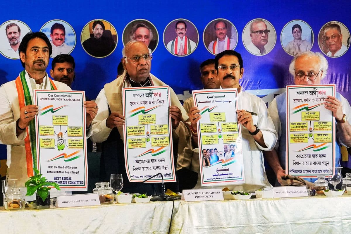 Congress Manifesto West Bengal 2026: पश्चिम बंगाल विधानसभा चुनाव 2026 के लिए कांग्रेस पार्टी ने अपना घोषणापत्र जारी कर दिया है. पार्टी ने बंगाल के लिए 5 गारंटी दी है. इन गारंटियों में दुर्गा सम्मान, कृषक सम्मान, विधान स्वास्थ्य सुरक्षा, युवा सम्मान और शिक्षार आलोक शामिल हैं. पार्टी ने कहा है कि हर गारंटी के लिए अलग मंत्रालय का गठन किया जायेगा, जो इसको लागू करेगा. पार्टी ने आर्थिक विकास के लिए इंडस्ट्रियल कॉरीडोर बनवाने का भी वादा किया है. कांग्रेस के राष्ट्रीय अध्यक्ष मल्लिकार्जुन खरगे और बंगाल प्रदेश कांग्रेस के प्रभारी गुलाम अहमद मीर ने कोलकाता में पार्टी का घोषणापत्र जारी किया.