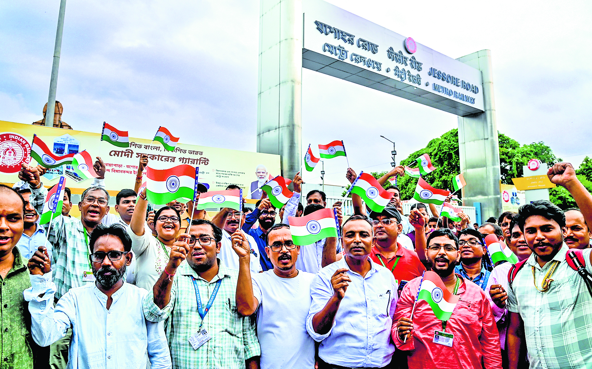 प्रधानमंत्री नरेंद्र मोदी के कोलकाता पहुंचने पर शुक्रवार को दमदम इलाके में सड़कों पर भारी भीड़ उमड़ पड़ी. जेसोर रोड मेट्रो स्टेशन से लेकर दमदम सेंट्रल जेल मैदान तक का मार्ग लोगों के उत्साह से गूंज उठा. प्रधानमंत्री का काफिला जैसे ही क्षेत्र से गुजरा, लोग नारे लगाते हुए और मोबाइल कैमरे में दृश्य कैद करते दिखायी दिये. महिलाएं भगवा साड़ी पहनकर ढोल की थाप पर नृत्य करती नजर आयीं, जबकि हजारों लोग प्रधानमंत्री की एक झलक पाने के लिए सड़क किनारे खड़े रहे. वाहन के भीतर बैठे मोदी लगातार हाथ जोड़कर और हाथ हिलाकर समर्थकों का अभिवादन करते रहे. भीड़ का उत्साह इतना अधिक था कि पूरा माहौल रोड शो जैसा लग रहा था, हालांकि यह प्रधानमंत्री के आधिकारिक कार्यक्रम का हिस्सा नहीं था. भाजपा सूत्रों का कहना है कि उम्मीद से कहीं अधिक भीड़ जुटी, जो राज्य में पार्टी के बढ़ते जनसमर्थन को दर्शाती है. विशेषज्ञ मान रहे हैं कि यह यात्रा 2026 के विधानसभा चुनाव से पहले भाजपा के लिए अहम है, क्योंकि पार्टी राज्य में जनाधार मजबूत करने और समर्थकों को उत्साहित करने की कोशिश में जुटी है.