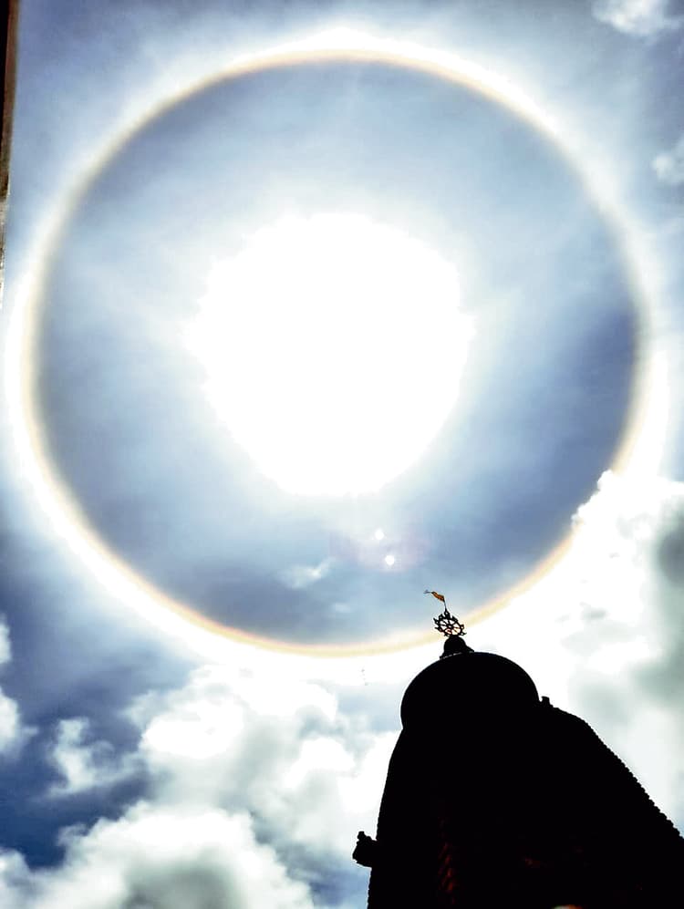 हल्दिया. बुधवार सुबह 11:30 बजे दीघा के जगन्नाथ धाम मंदिर के ऊपर आसमान में एक खूबसूरत इंद्रधनुष दिखाई दिया, जो सूर्य को अपने आगोश में लेता दिख रहा था. दीघा जगन्नाथ धाम के न्यासियों में से एक राधारमण दास का मानना है कि जन्माष्टमी की पूर्व संध्या पर यह दिव्य दृश्य स्वयं भगवान जगन्नाथ का आशीर्वाद है. इस अद्भुत दृश्य को देखने के लिए भक्तों की भीड़ उमड़ पड़ी.