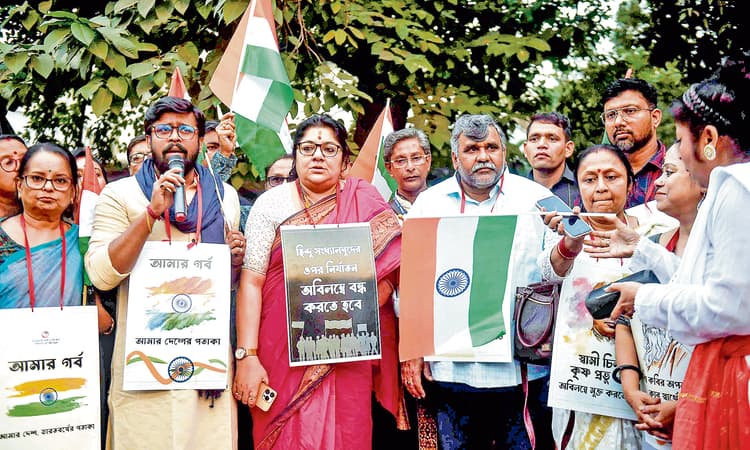 बांग्लादेश में अल्पसंख्यक समुदाय के लोगों पर हो रहे अत्याचार, मंदिरों पर हमले व हिंदू पुजारियों की गिरफ्तारी के खिलाफ शनिवार को भाजपा नेताओं ने महानगर में नंदन के पास विरोध प्रदर्शन किया. गौरतलब है कि नंदन में अभी कोलकाता इंटरनेशनल फिल्म फेस्टिवल का आयोजन किया जा रहा है. इसी बीच, शनिवार को भाजपा नेताओं व समाज के अन्य विशिष्ट जनों ने तिरंगा झंडा के साथ प्रदर्शन किया.इस मौके पर भाजपा की पूर्व सांसद लॉकेट चटर्जी, भाजपा नेता जितेंद्र तिवारी सहित अन्य नेता उपस्थित रहे. इस अवसर पर कलाकारों ने नुक्कड़ नाटक के जरिये बांग्लादेश की घटना को लेकर विरोध जताया. इस अवसर पर पार्टी की पूर्व सांसद लॉकेट चटर्जी ने कहा कि बांग्लादेश में हिंदुओं समेत अल्पसंख्यकों को उत्पीड़न का सामना करना पड़ रहा है, जिसे तुरंत रोकने की जरूरत है. हिंदुओं और अन्य अल्पसंख्यकों को मारा जा रहा है और उनके घर जलाये जा रहे हैं. भाजपा की महिला मोर्चा की नेता हिंदू अल्पसंख्यकों पर हमलों को रोकने में कथित विफलता के लिए बांग्लादेश की अंतरिम सरकार की आलोचना की और कहा कि ऐसी घटनाएं असहनीय हैं और इन्हें तुरंत रोका जाना चाहिए.बांग्लादेश में अल्पसंख्यकों पर हमले के खिलाफ निकाली रैली