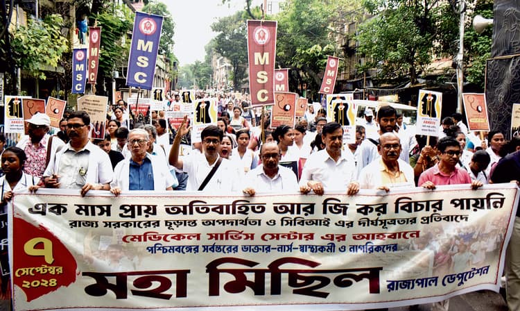 संवाददाता, कोलकाताआरजी कर मेडिकल कॉलेज एवं अस्पताल में जूनियर महिला डॉक्टर के साथ दुष्कर्म और हत्या की घटना के खिलाफ शनिवार को यहां चिकित्सकों तथा स्वास्थ्यकर्मियों ने बड़ी रैली निकाली. उन्होंने पीड़िता को इंसाफ दिलाने के लिए राज्यपाल सीवी आनंद बोस से मामले में हस्तक्षेप की अपील की है. रैली का आयोजन मेडिकल सर्विस सेंटर, सर्विस डॉक्टर फोरम, नर्सेस यूनिटी सहित अन्य नागरिक संगठनों ने किया था. एनआरएस मेडिकल कॉलेज एवं अस्पताल के इमरजेंसी गेट के सामने से शुरू हुए इस महाजुलूस को राजभवन तक जाना था. लेकिन, जुलूस के धर्मतला स्थित रानी रासमणि एवेन्यू पहुंचने पर पुलिस ने रोक दिया. इसके बाद सर्विस डॉक्टर फोरम के महासचिव डॉ सजल घोष के नेतृत्व में पांच सदस्यीय प्रतिनिधिमंडल राज्यपाल डॉ सीवी आनंद बोस को ज्ञापन सौंपने राजभवन पहुंचा. इस प्रतिनिधिमंडल में डॉ अशोक सामंत, डॉ सजल विश्वास, डॉ नीलरतन नैया, डॉ शुभेंदु मल्लिक और सिस्टर वासवती मुखर्जी शामिल रहे. हालांकि, चिकित्सकों का यह प्रतिनिधिमंडल राज्यपाल से नहीं मिल सका. इस बारे में सर्विस डॉक्टर फोरम के कोषाध्यक्ष डॉ सपन विश्वास ने कहा कि सोमवार को सुप्रीम कोर्ट में आरजी कर मामले की सुनवाई है. पर अब तक इस मामले में आरोपी संजय राय को छोड़ कर अन्य किसी की गिरफ्तारी नहीं हुई है. राज्यपाल राज्य के प्रशासनिक प्रमुख हैं. इसलिए हम चाहते हैं कि राज्यपाल के जरिये जांच प्रक्रिया में गति लाने के लिए सीबीआइ तक संदेश पहुंचाया जाये. पर राज्यपाल अनुपस्थित थे. रैली में शामिल डॉ विप्लव चंद्रा ने बताया कि आज राजभवन की ओर से अचानक 3 बजे बताया गया कि राज्यपाल मुंबई जा रहे हैं. ऐसे में राज्यपाल की अनुपस्थिति में उनके सचिव को ज्ञापन सौंपा गया. डॉ सजल घोष ने बताया कि पहले से समय देने के बावजूद राज्यपाल शनिवार को राजभवन में नहीं थे.चिकित्सकों की क्या हैं प्रमुख मांगें: