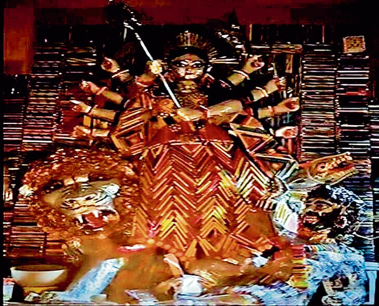 कल्याणी. नदिया जिला के माजदिया की एक गृहिणी पापिया कर ने 15,000 से अधिक पेन का उपयोग कर एक फैंसी दुर्गा प्रतिमा बनायी है. मूर्ति के आभूषण सहित अन्य जीचें भी कलम से ही बनायी गयी हैं. इस रचनात्मक पहल के जरिये वह आर जी कर अस्पताल की घटना के खिलाफ एक मूक प्रतीकात्मक संदेश देना चाहते हैं. उन्होंने कलम से राक्षस वध का प्रतीकात्मक त्रिशूल भी बनाया और बताया कि शिक्षा का प्रकाश इन राक्षसों का दमन कर सकता है. यह अभिनव दुर्गा प्रतिमा समाज में शिक्षा और न्याय के प्रति उनके गहरे विश्वास को दर्शाती है. उनके अनुसार, कलम, शक्ति का प्रतीक है और इस प्रकार उन्होंने कलम की तुलना त्रिशूल से करते हुए समाज के झूठ के खिलाफ आवाज उठायी है.