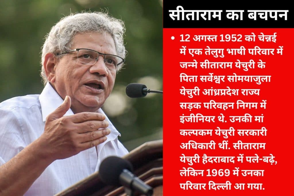 – 12 अगस्त 1952 को चेन्नई में एक तेलुगु भाषी परिवार में जन्मे सीताराम येचुरी के पिता सर्वेश्वर सोमयाजुला येचुरी आंध्रप्रदेश राज्य सड़क परिवहन निगम में इंजीनियर थे. उनकी मां कल्पकम येचुरी सरकारी अधिकारी थीं. सीताराम येचुरी हैदराबाद में पले-बढ़े, लेकिन 1969 में उनका परिवार दिल्ली आ गया.