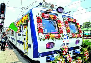 पूर्वी भारत की पहली एसी लोकल में जमकर खिंचवाई फोटो, ली सेल्फी यात्रियों के स्वागत में स्टेशन के छह नंबर प्लेटफॉर्म पर बिछाया गया रेड कारपेट कोलकाता. पूर्वी भारत की पहली एसी लोकल ट्रेन ने सियालदह स्टेशन से अपनी ऐतिहासिक शुरुआत की, जिसे लेकर यात्रियों में जबरदस्त उत्साह देखने को मिला. उद्घाटन यात्रा के दिन ही ट्रेन यात्रियों से खचाखच भरी रही. यात्रियों ने ट्रेन के भीतर और बाहर जमकर फोटो खिंचवाई और सेल्फी ली. स्टेशन के प्लेटफॉर्म नंबर छह पर विशेष स्वागत की व्यवस्था की गयी थी, जहां रेड कारपेट बिछा कर मेहमानों और यात्रियों का स्वागत किया गया. हावड़ा के लिलुआ से आये यात्री अंकुर राय ने बताया : मुंबई में एसी लोकल चलती थी, लेकिन अब कोलकाता का भी सपना पूरा हो गया. मैं इस ऐतिहासिक दिन का हिस्सा बनने के लिए खास सियालदह आया हूं. यह टिकट मेरे लिए यादगार रहेगा कि मैंने पहली एसी लोकल में यात्रा की थी. कोलकाता के विभिन्न हिस्सों से आये यात्रियों ने इस अनोखे सफर का आनंद उठाया.दोपहर ठीक 12 बजे केंद्रीय राज्य शिक्षा व उत्तर पूर्वी क्षेत्र विकास मंत्रालय के मंत्री सुकांत मजूमदार और केंद्रीय जहाजरानी राज्य मंत्री शांतनु ठाकुर ने सियालदह-राणाघाट एसी ईएमयू लोकल को हरी झंडी दिखाकर रवाना किया. इस मौके पर उद्घाटन ट्रेन को फूलों से सजाया गया था और माहौल में उत्सव जैसा उत्साह था.