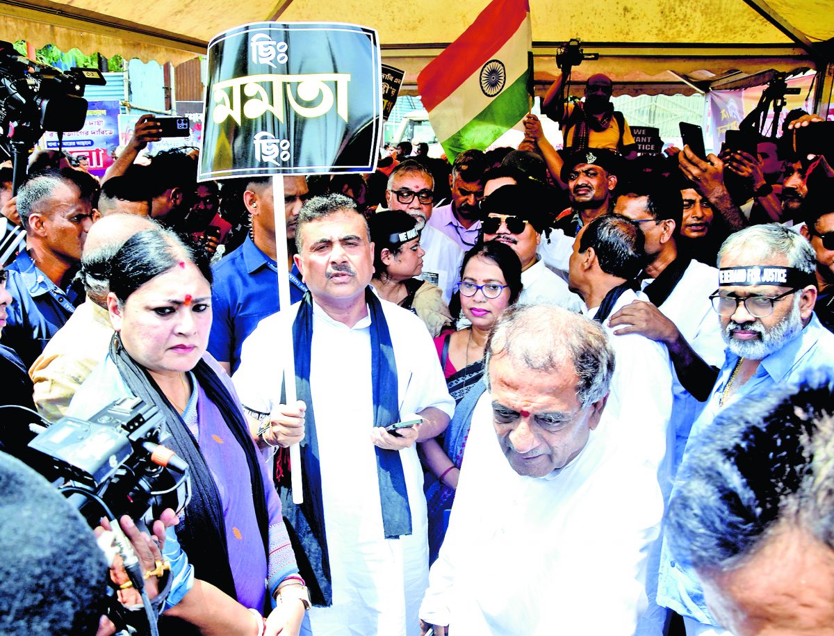 शुभेंदु पीड़िता के घायल माता-पिता से मिलने अस्पताल भी गये. उन्होंने बताया कि पीड़िता की मां की हालत बहुत गंभीर है, जबकि पिता की हालत थोड़ी बेहतर है. उन्होंने कहा कि आज के लिए धरना वापस लिया जा रहा है, लेकिन भाजपा नेतृत्व और अन्य हितधारकों के साथ विचार-विमर्श के बाद अगले आंदोलन पर फैसला लिया जायेगा. उन्होंने यह भी बताया कि धरना इसलिए भी वापस लिया गया क्योंकि जूनियर डॉक्टर्स फ्रंट और अभया मंच जल्द ही एक और आंदोलन शुरू करने वाले हैं और भाजपा चाहती है कि वे अपनी लड़ाई जारी रखें. अधिकारी ने प्रदर्शनकारियों पर पुलिस कार्रवाई की वीडियो क्लिप दिखाते हुए कहा कि वे कोलकाता पुलिस कमिश्नर मनोज वर्मा और अन्य पुलिस अधिकारियों के खिलाफ कार्रवाई की मांग करेंगे. उन्होंने आरोप लगाया कि रैली के दौरान माता-पिता को खत्म करने की साजिश रची गयी थी, क्योंकि उन्होंने सरकार की बात मानने से इनकार कर दिया था और अपनी बेटी के लिए न्याय की लड़ाई जारी रखी थी.