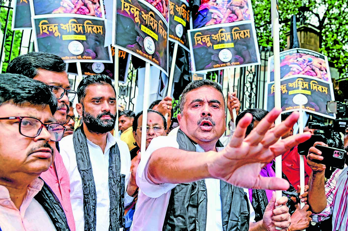 मुर्शिदाबाद जिले में हाल में हुई सांप्रदायिक हिंसा में हिंदुओं पर कथित अत्याचार के खिलाफ तख्तियां लेकर भाजपा विधायकों ने बुधवार को पश्चिम बंगाल विधानसभा के निकट ””हिंदू शहीद दिवस”” मनाया और मुख्यमंत्री ममता बनर्जी के इस्तीफे की मांग की. उन्होंने उन पिता-पुत्र के लिए भी न्याय की मांग की जिनकी पिछले सप्ताह मुस्लिम बहुल जिले में हिंसा के दौरान भीड़ ने हत्या कर दी थी.