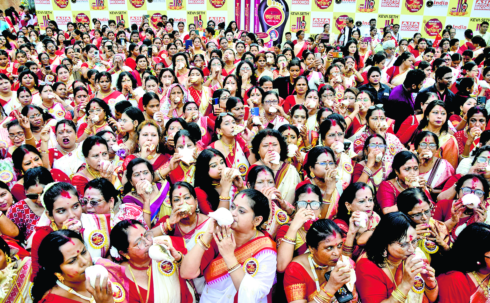 कोलकाता में रविवार को महालया पर महिलाओं ने एक साथ शंख बजाकर इतिहास रच दिया. केया सेठ आलता सिंदूर ‘शक्ति आराधना’ को एशिया बुक ऑफ रिकॉर्ड्स और इंडिया बुक ऑफ रिकॉर्ड्स में दर्ज किया गया. देशप्रिय पार्क दुर्गोत्सव में पारंपरिक साड़ी, आलता और सिंदूर से सजीं 672 महिलाएं देवी पक्ष का स्वागत करने के लिए एकत्रित हुईं और एक साथ बजाये गये 672 शंखों की गड़गड़ाहट से वातावरण गूंज उठा. इस मौके पर अरोमाथेरेपी की संस्थापक केया सेठ ने कहा कि ऐसा नजारा पहले कभी किसी ने नहीं देखा होगा.यहां एक विशाल नारी शक्ति ने मां दुर्गा के आगमन का अभिनंदन किया.