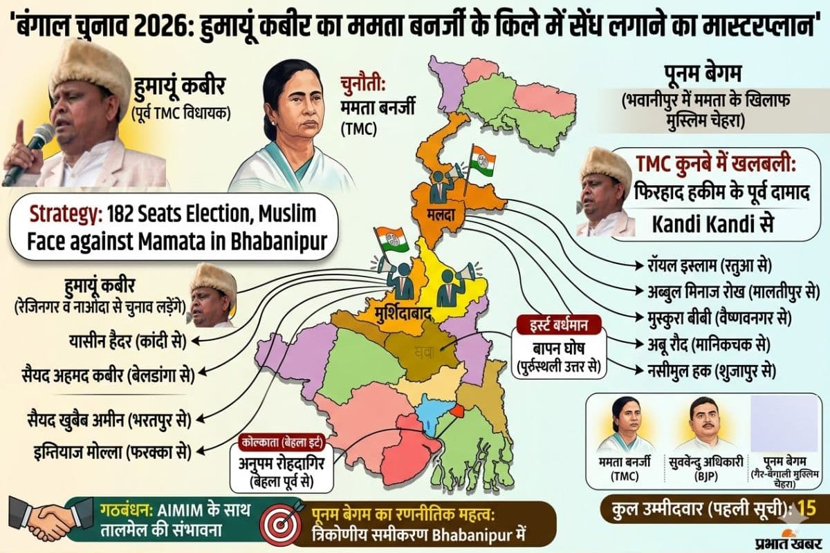 हुमायूं कबीर ने बताया कि दक्षिण कोलकाता की भवानीपुर सीट पर तृणमूल कांग्रेस सुप्रीमो ममता बनर्जी के खिलाफ पूनम बेगम चुनाव लड़ेंगी. कबीर के इस दांव को अल्पसंख्यक वोटों के ध्रुवीकरण की कोशिश माना जा रहा है. उन्होंने यह भी संकेत दिये कि असदुद्दीन ओवैसी की पार्टी एआईएमआईएम (AIMIM) के साथ उनकी पार्टी का तालमेल हो सकता है, जिससे कुछ सीटों पर दोस्ताना मुकाबला या समर्थन की स्थिति बनेगी.