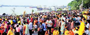 अस्ताचलगामी सूर्य को अर्घ्य देने उमड़े श्रद्धालु कोलकाता. छठ पर्व के ‘संध्या अर्घ्य’ के दिन सोमवार शाम को समूचे कोलकाता में नदियों और अन्य जलाशयों के किनारे घाटों पर लाखों श्रद्धालुओं ने सूर्य देव को अर्घ्य दिया. मंगलवार सुबह उगते सूर्य को अर्घ्य देने के लिए घाटों पर फिर से श्रद्धालु एकत्रित होंगे और इसके साथ ही भक्ति, कृतज्ञता और पवित्रता के प्रतीक इस चार दिवसीय पर्व का समापन हो जायेगा. घाटों पर सुरक्षा के कड़े इंतजाम किये गये थे. महानगर के दही घाट, तख्ता घाट, बाजे कदमतला घाट से लेकर बाबू घाट तक भारी संख्या में लोगों की भीड़ जुटी थी. छठ गीतों से महानगर गूंज उठा था. महानगर का नजारा मिनी बिहार की तरह हो गया था. कोलकाता नगर निगम के एक अधिकारी के अनुसार, श्रद्धालुओं ने सूर्यास्त से पहले शहर के जलाशयों के आसपास 188 घाटों पर पूजा-अर्चना की. निगम इनमें से 149 घाटों का रखरखाव करता है, जबकि 39 घाटों का रखरखाव कोलकाता महानगर विकास प्राधिकरण द्वारा किया जाता है. तस्वीर हुगली नदी के किनारे बाजे कदमतला घाट की है.