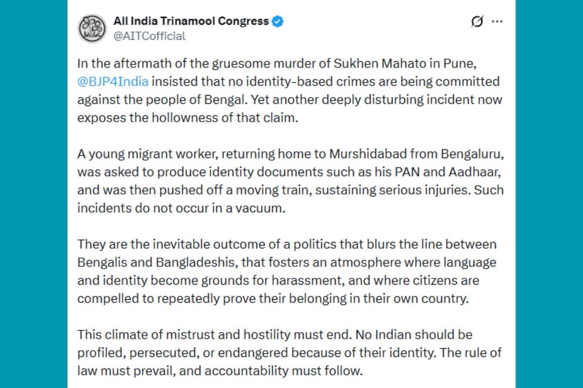 घटना बेलदा थाना क्षेत्र के बखराबाद रेलवे स्टेशन की बतायी गयी थी. युवक ने दावा किया था कि 2 अज्ञात लोगों ने उससे पहचान का प्रमाण पत्र मांगा और उसे बांग्लादेशी बताकर ट्रेन से धक्का देकर नीचे गिरा दिया. आरोप गंभीर था. बंगाल की रूलिंग पार्टी तृणमूल कांग्रेस ने अपने ऑफिशियल एक्स हैंडल से इस मामले को पोस्ट किया. इससे मामला संवेदनशील बन गया.