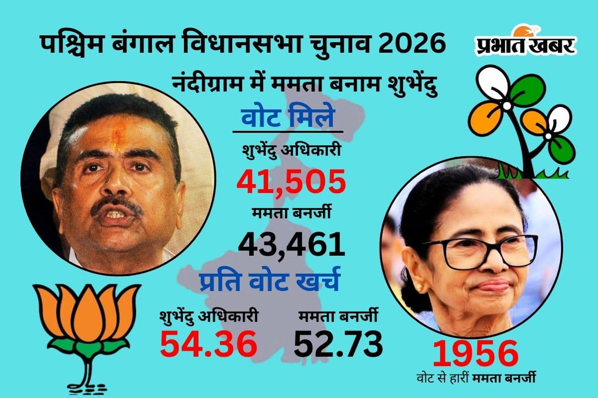 - शुभेंदु अधिकारी को नंदीग्राम में 43,461 वोट मिले. उनका प्रति वोट खर्च 54.36 रुपए रहा.