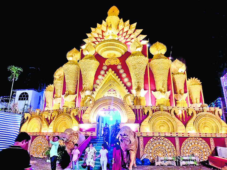 नीरोदगढ़ सबुज संघ ने अपनी 75वीं वर्षगांठ पर राजस्थान के राजमहल की तर्ज पर एक भव्य पंडाल तैयार किया है. पंडाल के भीतर राजाओं की तस्वीरों, राजमहल के दृश्यों, प्राचीन शस्त्रों के मॉडलों और नृसिंह अवतार की झांकी के माध्यम से मां काली के कृष्ण काली रूप को प्रदर्शित किया गया है. यह पंडाल शक्ति और शांति दोनों का संदेश देता है. पंडाल के उद्घाटन समारोह में क्लब के अध्यक्ष असित चट्टोपाध्याय, सचिव सुजीत दत्ता, सानू चक्रवर्ती और उपदेशक मनोज चक्रवर्ती सहित अन्य पदाधिकारी उपस्थित थे. मध्यमपाड़ा व्यापारी समिति तरुण संघ ने अपनी 58वीं वर्षगांठ के लिए ‘विविध रंग’ थीम चुनी है, जहां मां काली दसभुजा रूप में विराजमान हैं. प्रगति संघ ने दक्षिण भारतीय मंदिर शैली में पंडाल बनाया है.