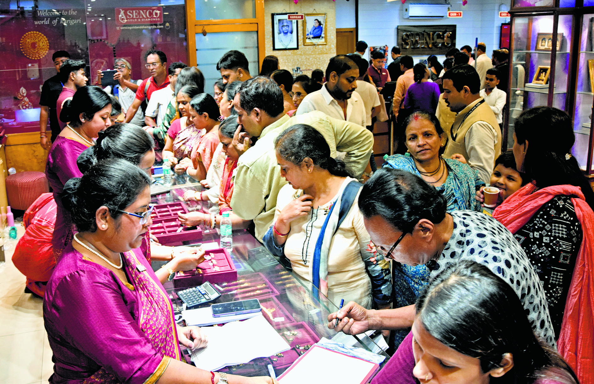 कोलकाता. धनतेरस पर खरीदारी के लिए शनिवार को लोग बाजारों में उमड़ पड़े. कोलकाता के बाजारों में जबरदस्त भीड़ रही. राज्यवासी सोना-चांदी, बर्तन, इलेक्ट्रॉनिक्स और ऑटोमोबाइल जैसी वस्तुएं खरीदते नजर आये. धनतेरस के मौके पर इलेक्ट्रॉनिक, ऑटोमोबाइल, बर्तन और गहनों की दुकानों पर लोगों की भीड़ उमड़ी. जीएसटी दरों में कटौती के बाद बाजारों की रौनक और बढ़ गयी. कोलकाता के मौलाली में गहने की एक दुकान में खरीदारी करते लोग. देखें पेज 05 भी