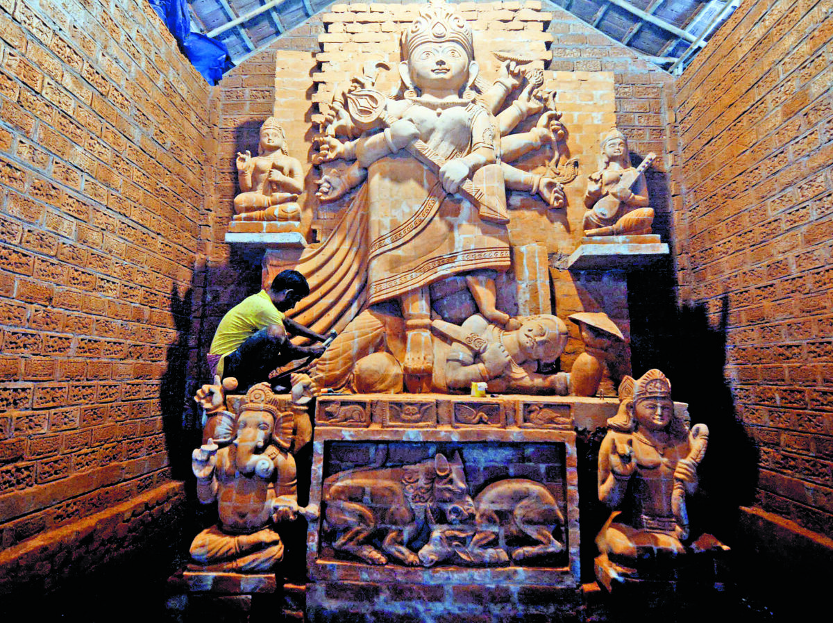 ईंट और टाली से बन रहा पूजा पंडाल और प्रतिमा