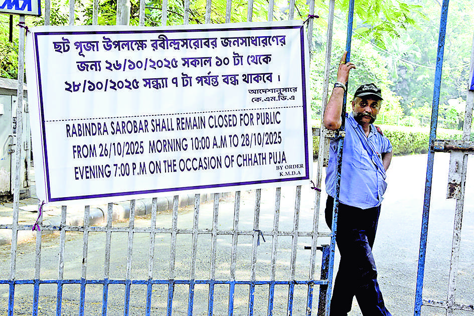 लोकआस्था के चार दिवसीय पर्व छठ पूजा के तीसरे दिन यानी रविवार को अस्तगामी सूर्य को अर्घ्य देने की परंपरा के बीच रवींद्र सरोवर (लेक) को आम जनता के लिए बंद कर दिया गया है. कोलकाता महानगर विकास प्राधिकरण (केएमडीए) ने राष्ट्रीय पर्यावरण न्यायाधिकरण के आदेश के अनुपालन में यह निर्णय लिया है. अब रवींद्र सरोवर मंगलवार शाम छह बजे तक बंद रहेगा.
