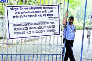 लोकआस्था के चार दिवसीय पर्व छठ पूजा के तीसरे दिन यानी रविवार को अस्तगामी सूर्य को अर्घ्य देने की परंपरा के बीच रवींद्र सरोवर (लेक) को आम जनता के लिए बंद कर दिया गया है. कोलकाता महानगर विकास प्राधिकरण (केएमडीए) ने राष्ट्रीय पर्यावरण न्यायाधिकरण के आदेश के अनुपालन में यह निर्णय लिया है. अब रवींद्र सरोवर मंगलवार शाम छह बजे तक बंद रहेगा.