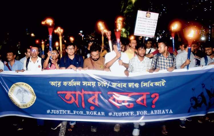 आरजी कर अस्पताल में गत नौ अगस्त की घटना की शिकार महिला प्रशिक्षु चिकित्सक के लिए न्याय की मांग कर रहे जूनियर चिकित्सकों ने बुधवार शाम को आम लोगों के साथ मशाल जुलूस निकाला. महिला जूनियर चिकित्सक से दुष्कर्म के बाद उसकी हत्या कर दी गयी थी. पश्चिम बंगाल कनिष्ठ चिकित्सक मंच और कई नागरिक समाज संगठनों के प्रतिनिधियों ने सॉल्टलेक के सेक्टर थ्री स्थित पश्चिम बंगाल मेडिकल काउंसिल कार्यालय से सेक्टर वन में सीजीओ कॉम्प्लेक्स स्थित सीबीआइ कार्यालय तक रैली निकाली.