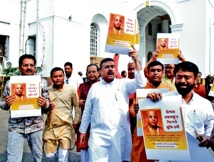 बांग्लादेश में हिंदू समुदाय के नेता चिन्मय प्रभु की गिरफ्तारी का कड़ा विरोध आज बांग्लादेश उपउच्चायोग का घेराव करेगी भाजपा कोलकाता. बांग्लादेश में इस्कॉन भिक्षु और हिंदू समुदाय के नेता चिन्मय कृष्ण दास ब्रह्मचारी (चिन्मय प्रभु) की गिरफ्तारी का राज्य विधानसभा के नेता प्रतिपक्ष शुभेंदु अधिकारी ने कड़ा विरोध किया है. अधिकारी ने चिन्मय प्रभु की शीघ्र रिहाई की मांग करते हुए बांग्लादेश सरकार को कड़ी चेतावनी दी. इस घटना के विरोध में मंगलवार को भाजपा विधायकों ने विधानसभा के बाहर प्रदर्शन किया. श्री अधिकारी ने चिन्मय प्रभु की रिहाई न होने पर भारत-बांग्लादेश सीमा पेट्रापोल को ठप करने की चेतावनी दी है. गौरतलब है कि बांग्लादेश में उत्पीड़ित हिंदुओं के प्रतिनिधि इस्कॉन के भिक्षु चिन्मय कृष्ण दास प्रभु को सोमवार को ढाका में गिरफ्तार कर लिया गया. जैसे ही यह खबर फैली, पड़ोसी देश में अल्पसंख्यक हिंदू समुदाय का आंदोलन उग्र हो गया. अधिकारी ने बांग्लादेश की सरकार के खिलाफ अपना गुस्सा जाहिर किया. यूनुस सरकार को ‘कट्टरपंथी’ करार देते हुए उन्होंने कहा: चिन्मय प्रभु वहां सनातन हिंदू समाज के सम्माननीय प्रतिनिधि हैं. वह अल्पसंख्यकों की सुरक्षा के लिए लड़ रहे हैं. अगर उन्हें जल्द रिहा नहीं किया गया, तो हम भारत की ओर से दी जाने वाली सभी सेवाएं बंद कर देंगे. याद रखें, यहां से सारा सामान बांग्लादेश पहुंचता है. चिन्मय प्रभु की गिरफ्तारी के खिलाफ मंगलवार को भाजपा विधायकों ने विधानसभा के बाहर विरोध प्रदर्शन किया. उनके हाथों में पोस्टर थे, जिस पर लिखा था : हम चिन्मय महाप्रभु की बिना शर्त रिहाई चाहते हैं. श्री अधिकारी ने कहा कि चिन्मय प्रभु की तत्काल रिहाई की मांग को लेकर राज्य के भाजपा विधायक बुधवार को यहां बांग्लादेश उप उच्चायोग तक मार्च निकालेंगे और उसका ‘घेराव’ करेंगे. उन्होंने कहा: मैंने बुधवार अपराह्न तीन बजे कोलकाता में बांग्लादेश के उप उच्चायोग में अधिकारियों से मुलाकात का समय मांगा है, सभी भाजपा विधायक वहां जायेंगे. हम उप उच्चायोग तक मार्च निकालेंगे और उसका घेराव करेंगे. भाजपा नेता ने कहा कि वे बांग्लादेश उप उच्चायोग तक मार्च करेंगे, भले ही उन्हें वहां से कोई जवाब मिले या नहीं. उन्होंने यह भी चेतावनी दी कि भाजपा उत्तर 24 परगना जिले के पेट्रापोल में भारत-बांग्लादेश सीमा पर नाकाबंदी करेगी. श्री अधिकारी ने बताया कि एक अन्य संगठन हिंदू जागरण मंच ने दास की गिरफ्तारी के विरोध में गुरुवार को सियालदह से बांग्लादेश उप उच्चायोग तक विरोध मार्च निकालने का आह्वान किया है.