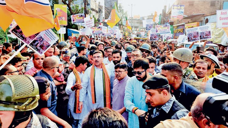 संवाददाता, कोलकातादक्षिण 24 परगना जिले के बारुईपुर में बुधवार को विधानसभा में विपक्ष के नेता व भाजपा विधायक शुभेंदु अधिकारी के नेतृत्व में भगवा दल द्वारा रास मैदान से एसपी कार्यालय तक पदयात्रा निकालने की बात थी. हालांकि, उसके पहले ही माहौल तनावपूर्ण हो गया. भाजपा की पदयात्रा जिस स्थान से निकाली जाने वाली थी, उसके पास ही पुरातन बाजार व शिवानी पीठ इलाकों में भाजपा की इस पदयात्रा के खिलाफ तृणमूल कांग्रेस व तृणमूल महिला कांग्रेस का धरना-प्रदर्शन चल रहा था. बुधवार को जब भाजपा नेता शुभेंदु अधिकारी का काफिला रास मैदान जाने के लिए बारुईपुर पुरातन बाजार से गुजर रहा था. तभी कथित तृणमूल कांग्रेस समर्थकों द्वारा उन्हें काले झंडे दिखाये गये. इतना ही नहीं, भाजपा नेता के समक्ष ‘गो बैक’ के नारे भी लगाये गये. दूसरी ओर, भाजपा समर्थकों ने भी स्थानीय विधायक व विधानसभा के स्पीकर बिमान बनर्जी व सत्तारूढ़ दल के खिलाफ नारेबाजी की. दोनों दलों के समर्थक जैसे आमने-सामने हो गये. इलाके में तैनात बड़ी संख्या में पुलिसकर्मियों ने काफी मशक्कत के बाद हालात को सामान्य किया. अंतत: भाजपा को अपनी पदयात्रा रद्द करनी पड़ी. हालांकि, रास मैदान में शुभेंदु अधिकारी ने भाजपा नेताओं व कार्यकर्ताओं को संबोधित किया. भाजपा की ओर से तृणमूल द्वारा माहौल अशांत करने का आरोप लगाया गया, जबकि तृणमूल ने इसे आधारहीन करार दिया है.