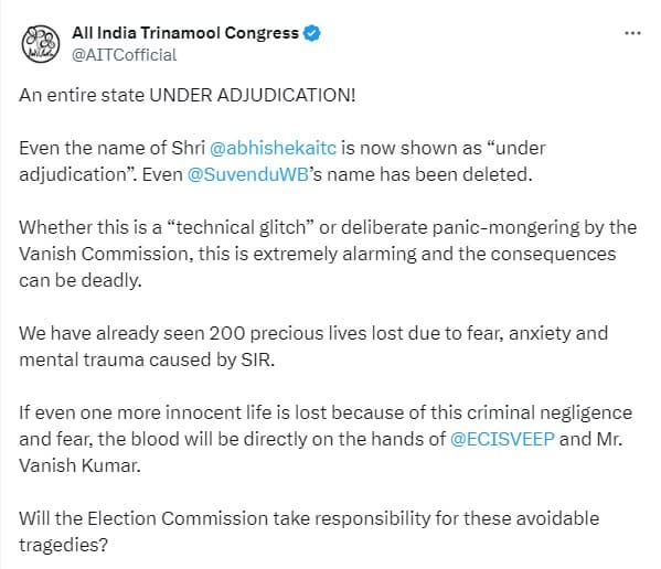 तृणमूल कांग्रेस की ओर से कहा गया है कि आयोग के इस तरह से सूची निर्माण के परिणाम घातक हो सकते हैं. एसआईआर के कारण उत्पन्न भय, चिंता और मानसिक आघात से हम पहले ही 200 अनमोल जिंदगियां खो चुके हैं. यदि इस आपराधिक लापरवाही और भय के कारण एक और निर्दोष जीवन भी खत्म हो जाता है, तो इसका खून सीधे तौर पर चुनाव आयोग और वनीश कुमार के हाथों पर होगा. क्या चुनाव आयोग इन टाली जा सकने वाली त्रासदियों की जिम्मेदारी लेगा.