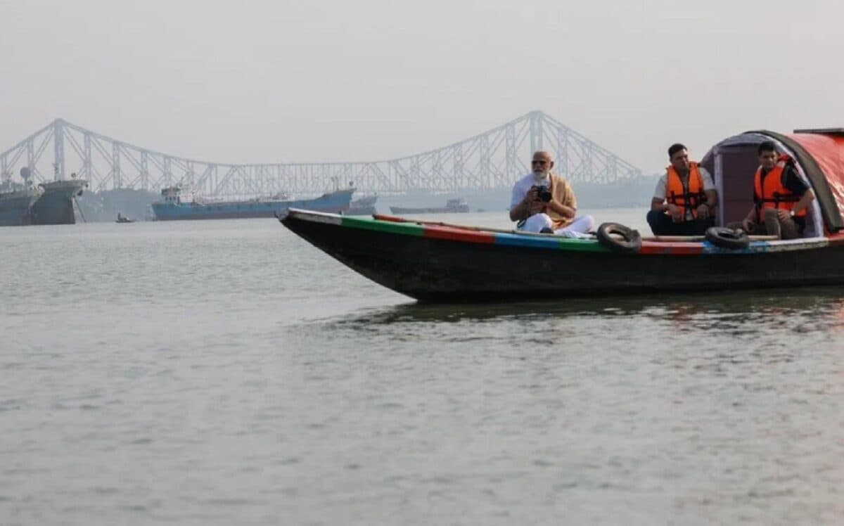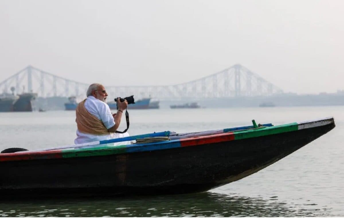 Modi Hooghly Tour: उन्होंने नाव की सवारी के दौरान कैमरे से तस्वीरें भी खींचीं. उन्होंने कोलकाता की खूबसूरती को कैमरे में कैद किया.