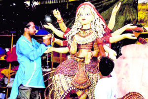 उन्होंने मां दुर्गा की प्रतिमा को पूरी तरह सूखे फूल, फल, पत्ते और पेड़ों के उच्छिष्ट हिस्सों से तैयार किया है.