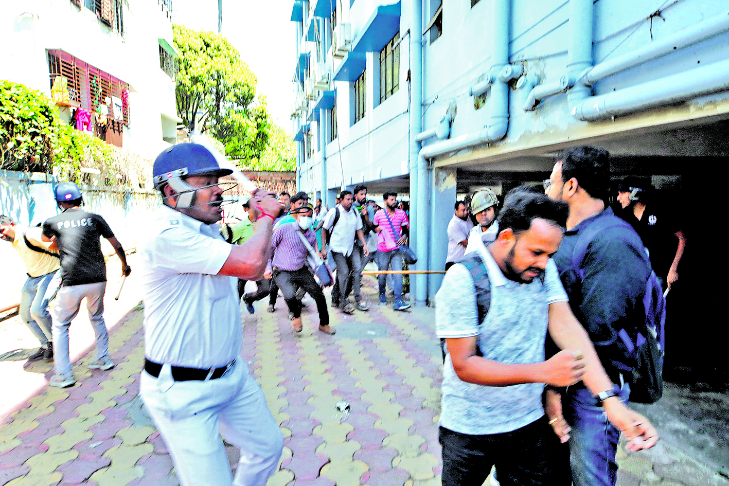भिड़ंत. कसबा में डीआइ ऑफिस के बाहर प्रदर्शन के दौरान हालात बिगड़े कोलकाता. सुप्रीम कोर्ट के एक फैसले के बाद अपनी नौकरी गंवाने वाले शिक्षक और अन्य गैर-शिक्षण कर्मचारियों के एक वर्ग ने बुधवार को दक्षिण कोलकाता के कसबा इलाके में राज्य स्कूल विभाग के एक कार्यालय के बाहर प्रदर्शन किया. एक संगठन की तरफ से इसी दिन राज्यभर में प्रदर्शन करने का आह्वान किया गया था. कसबा में प्रदर्शन के दौरान कई प्रदर्शनकारी शिक्षकों के साथ पुलिस की झड़प हो गयी. प्रदर्शनकारियों ने आरोप लगाया कि पुलिसकर्मियों ने कसबा इलाके में जिला निरीक्षक (डीआइ) कार्यालय के बाहर से उन्हें तितर-बितर करने के लिए लाठीचार्ज करने के अलावा पैर से पीटा और धक्का-मुक्की देकर जमीन पर गिरा कर उन पर लाठियां बरसायीं. प्रदर्शनकारियों ने यह भी दावा किया कि लाठीचार्ज में उनमें से कुछ लोग जख्मी भी हो गये, लेकिन पुलिस का जुल्म जारी रहा. इधर, लालबाजार में पुलिस की एक वरिष्ठ अधिकारी ने बताया कि प्रदर्शनकारियों ने डीआइ कार्यालय का दरवाजा तोड़ दिया और जबरन परिसर में घुस गये. उन्हें रोकने की काफी कोशिश की गयी. कई बार चेतावनी भी दी गयी. पुलिस का आरोप है कि पहले प्रदर्शनकारियों ने पुलिस के साथ मारपीट शुरू की. हमले में दो महिलाएं समेत चार पुलिसकर्मी घायल हुए हैं. इधर, नौकरी गंवाने वाले शिक्षकों और अन्य कर्मचारियों ने कहा कि वे शांतिपूर्ण प्रदर्शन कर रहे थे फिर भी पुलिस ने उन पर बल प्रयोग किया. पुलिस की कार्रवाई की भाजपा ने निंदा की है. पुलिस अधिकारियों का दावा : हमने हर स्तर पर संयम बरता लालबाजार में कोलकाता पुलिस के संयुक्त आयुक्त (मुख्यालय) मिराज खालिद ने कहा कि पुलिसकर्मियों ने हर स्तर पर संयम बरता. शुरुआत से हमला प्रदर्शनकारी शिक्षकों की तरफ से किया जा रहा था. हमला किये जाने के बाद पुलिसकर्मियों ने बचाव में कदम उठाया. इधर, कोलकाता पुलिस की तरफ से सोशल मीडिया में कहा गया कि अनियंत्रित भीड़ ने कसबा इलाके में स्थित डीआइ कार्यालय के बाहर महिला पुलिसकर्मियों सहित पुलिस जवानों पर अकारण हिंसक हमला कर दिया. इसमें चार पुरुष और दो महिला पुलिसकर्मी घायल हो गये हैं. उनका इलाज चल रहा है. पुलिस ने अपने फेसबुक पेज पर एक पोस्ट में कहा कि पुलिस को भीड़ को तितर-बितर करने, चोटों व संपत्ति की क्षति को रोकने के लिए हल्का बल प्रयोग करने के लिए मजबूर होना पड़ा. घटना की जांच की जा रही है. इस बीच, पुलिस उपायुक्त (एसएसडी) विदिशा कलिता ने संवाददाताओं से कहा : हम इस मामले में जुड़े आरोपियों के खिलाफ कानूनी कार्रवाई करेंगे. भाजपा ने की पुलिस कार्रवाई की निंदा इस घटना के बाद भाजपा की तरफ से पुलिस की कार्रवाई की आलोचना करते हुए लालबाजार अभियान किया गया. भाजपा ने आरोप लगाया कि 