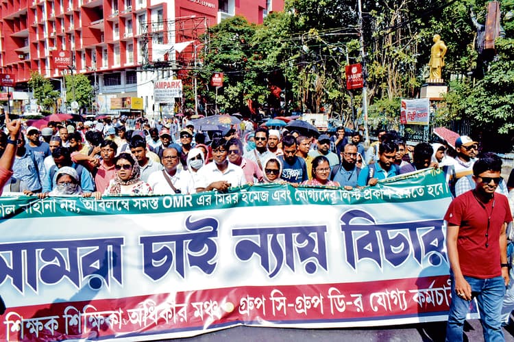 ओएमआर शीट प्रकाशित करने की मांग को लेकर एसएससी कार्यालय के बाहर अनशन पर बैठे कोलकाता. सुप्रीम कोर्ट के आदेश के बाद नौकरी गंवाने वाले शिक्षकों का आंदोलन गुरुवार को भी जारी रहा. बुधवार देर रात से कुछ शिक्षकों ने स्कूल सेवा आयोग (एसएससी) कार्यालय के सामने अनशन शुरू किया है. नौकरी गंवाने वाले शिक्षकों और अन्य कर्मचारियों ने कहा कि राज्य सरकार की उदासीनता के कारण ऐसा हो रहा है. हमारी मांग बस यह है कि एसएससी ओएमआर शीट प्रकाशित करे. अगर एसएससी व राज्य सरकार द्वारा ओएमआर शीट जमा कर दिया जाता तो योग्य व अयोग्य शिक्षक का खुलासा हो जाता, लेकिन राज्य सरकार ने ऐसा नहीं किया. इसके साथ ही उन्होंने बुधवार को दक्षिण कोलकाता के कसबा स्थित जिला निरीक्षक (डीआइ) कार्यालय में उनके सहयोगियों के खिलाफ हुई पुलिस कार्रवाई का भी विरोध किया. उधर, नौकरी गंवाने वाले करीब 500 शिक्षकों ने गुरुवार को शहर में रैली निकाली और मांग की कि उन्हें दंडित नहीं किया जाना चाहिए और उन्हें ‘दागी’ लोगों के साथ नहीं जोड़ा जाना चाहिए. नियुक्तियों में गड़बड़ी के चलते सुप्रीम कोर्ट ने हाल में लगभग 26,000 शिक्षकों व गैर शिक्षण कर्मचारियों की नियुक्ति को अमान्य करार दिया है. ‘जोग्यो (योग्य) शिक्षक मंच” के एक प्रवक्ता महबूब मंडल ने कहा कि हम योग्य शिक्षकों की मांगों को लेकर सड़कों पर उतरे हैं. हम चाहते हैं कि 2016 में नियुक्ति परीक्षा में बैठने वाले और नियुक्ति पत्र पाने वाले योग्य और दागी उम्मीदवारों के बीच अंतर करने में स्कूल सेवा आयोग (एसएससी) की नाकामी के लिए उन्हें दंडित न किया जाये. महबूब मंडल ने कहा कि शहर में जिला शिक्षा निरीक्षक के कार्यालय में ज्ञापन को सौंपने के लिए जाने के दौरान पुलिस ने हम पर लाठीचार्ज किया और एक पुलिस अधिकारी ने हमें लात मारी. हम राज्य सरकार द्वारा बड़े पैमाने पर भ्रष्टाचार के कारण हमारी नौकरियों को छीने जाने के खिलाफ लोकतांत्रिक तरीके से विरोध भी नहीं कर सकते. तो अब हम कहां जाएं? हम सड़कों पर हैं और कोई दूसरा विकल्प नहीं मिल रहा है. यह पूछे जाने पर कि क्या वे एसएससी कार्यालय के सामने योग्य शिक्षकों के दूसरे समूह के साथ क्रमिक भूख हड़ताल में शामिल होंगे, इस पर महबूब मंडल ने कहा: हम इस कार्यक्रम के बाद फैसला करेंगे. अगर वे (अनशन करने वाले शिक्षक) भी योग्य हैं, तो हम उनके साथ होंगे. उन्होंने यह भी स्पष्ट किया कि मंच का संबंध शहीद मीनार मैदान में धरना दे रहे शिक्षकों के दूसरे वर्ग से नहीं है, बल्कि वह किसी भी योग्य उम्मीदवार की जायज मांग का समर्थन करेगा. गौरतलब है कि गुरुवार को एक रैली सेंट्रल एवेन्यू से होते हुए दो किलोमीटर से अधिक की दूरी तय कर एस्प्लेनेड पहुंची, जबकि दूसरी रैली सियालदह में निकाली गयी, जो धर्मतला प