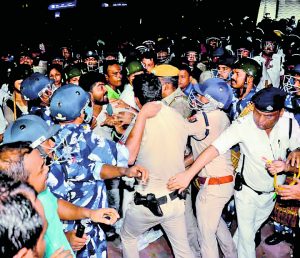 लोहे का गेट तोड़कर प्रदर्शनकारी विकास भवन परिसर में घुसे, पुलिस कार्रवाई में कई घायल, ‘योग्य शिक्षकों’ की सूची प्रकाशित करने की मांग