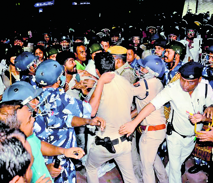 गुरुवार रात को शिक्षा विभाग के कार्यालय ‘विकास भवन’ से प्रदर्शनकारियों को हटाते पुलिसकर्मी.
