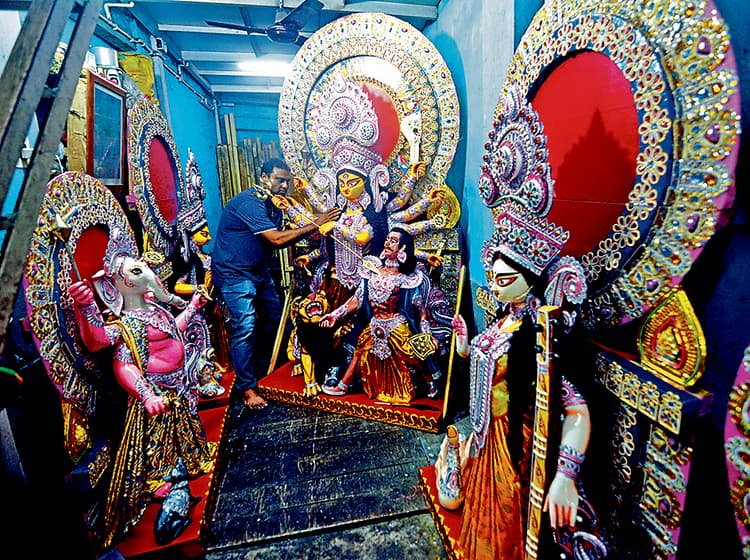 कोलकाता. पश्चिम बंगाल की दुर्गापूजा देश ही नहीं, बल्कि दुनिया में प्रसिद्ध है. इसे लेकर काफी पहले से ही तैयारी शुरू हो जाती है. कुम्हारटोली में मूर्तिकार भव्य मूर्तियां तैयार करते हैं. यहां तक की देश के साथ ही विदेशों में भी यहां की मूर्तियों की मांग रहती है. हर साल की तरह ही इस साल भी कुम्हारटोली से मूर्तिकार कौशिक घोष की मूर्तियां विदेशों में जाने लगी है. उन्होंने बताया कि कुछ मूर्तियां चली गयी है. कुछ बाकी है. केन्या के लिए फाइबर की मूर्ति को अंतिम रूप दे रहे है, जो जल्द ही केन्या के लिए भेजा जायेगा. मूर्ति आठ फीट लंबा और 15 फूट चौड़ा है. बजट साढे तीन लाख से चार लाख के करीब है. जनवरी से ही मूर्तियों को भेजना शुरू कर दिये हैं.
