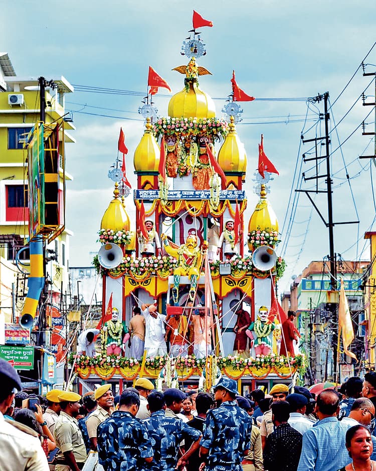 हुगली. चंदननगर के रथ की स्थापना का इतिहास अत्यंत रोचक है. सन 1776 ई में चंदननगर के महात्मा यादवेंदु घोष ने अपने घर से सटे बगीचे में स्थित एक नीम के पेड़ की लकड़ी से सुंदर और कलात्मक रथ का निर्माण कराया था. जनसाधारण की भागीदारी और उत्साह के कारण चंदननगर का रथ आज भी अपनी परंपरा और गौरव को अक्षुण्ण बनाए हुए है. गुरुवार सुबह जिलाधिकारी मुक्ता आर्य, चंदननगर के पुलिस कमिश्नर अमित पी ज्वालगी, एसडीओ विष्णु दास, एसीपी शुभेंदु बनर्जी, एसडीआइसीओ स्वर्णाली दास सहित अन्य गणमान्य अधिकारी की उपस्थिति में रथयात्रा निकाली जायेगी. शाम को तालेगांव पहुंचेगा. यह रथ पूरी तरह से लोहे से निर्मित है. लकड़ी का रथ कमजोर होने के बाद 1962 में चंदननगर लक्ष्मीगंज रथ संचालन समिति, गोंदलपाड़ा जूट मिल, आम नागरिकों के आर्थिक सहयोग और मेसर्स ब्रेथवेट एंड कंपनी लिमिटेड की सहायता से लोहे का रथ तैयार किया गया. यह रथ पुराने रथ की ही शैली में निर्मित है और इसका अनुमानित वजन 60 टन है. रथ की ऊंचाई 40 फीट, लंबाई और चौड़ाई 22 फीट है. यह रथ चार मंजिला है और इसमें कुल 14 पहिये हैं, जिनमें प्रत्येक का वजन एक टन है. रथ की पहली मंजिल पर चारों कोनों में चार महिलाओं की मूर्तियां हैं. दूसरी मंजिल पर दो तेजस्वी सफेद घोड़े रथ को खींच रहे हैं और साथ में सारथी हैं. तीसरी मंजिल पर चार द्वारपाल पूर्व में इंद्र, पश्चिम में वरुण, उत्तर में कुबेर और दक्षिण में यमराज विराजमान हैं. चौथी और अंतिम मंजिल के मध्य में महाप्रभु श्रीश्री जगन्नाथ देव, दक्षिण में बहन सुभद्रा और बायीं ओर बलराम स्थापित हैं.