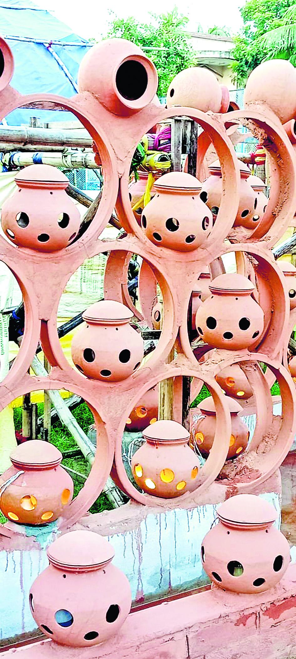 अब, कबूतरखाने जैसे फ्लैटों में ऐसा करना संभव नहीं है. वह अच्छी आदत अब लुप्त हो गयी है. इस प्राकृतिक तरीके को जीवन में अपनाने और नीर के संरक्षण के प्रति लोगों को सचेत करने की थीम के साथ पंडाल कलाकार प्रबीर साहा ने तैयार किया है. इन सामग्री से एक पूरी तरह से पर्यावरण के अनुकूल लेकिन बेहद रचनात्मक मंडप बनाया जा रहा है, जिससे लोग पानी के महत्व को समझें और उसका सदुपयोग करें. लोग पुराने दिनों की उन अच्छी आदतों को एक बार फिर याद करें और उन सभी कोशिशों से जुड़ें, जो उनके स्वास्थ्य के लिए अच्छी हैं. इस मंडप को मिट्टी के बर्तन और कलात्मक चीजों से सजाया गया है. मां दुर्गा का दर्शन करने आने वाले लोगों के लिए यहां प्राकृतिक ठंड का परिवेश तैयार किया गया है.