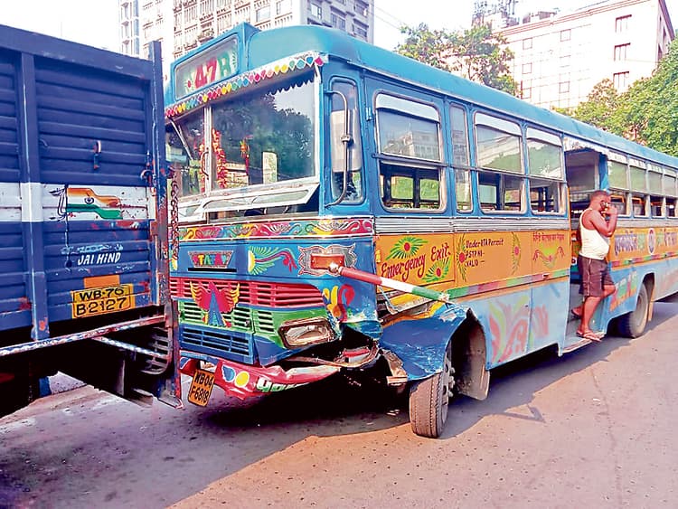 मध्य कोलकाता के जेएल नेहरू रोड पर रोटरी क्लब के निकट एक के बाद एक कई गाड़ियों से टकरा कर 47बी रूट की एक निजी बस दुर्घटनाग्रस्त हो गयी. घटना बुधवार दोपहर 3.15 बजे के करीब की है. इस दुर्घटना में किसी भी व्यक्ति को चोट नहीं आयी. दुर्घटना के कारण सड़क किनारे खड़े कई निजी वाहन व बाइक को नुकसान पहुंचा है. खबर पाकर शेक्सपीयर सरणी थाने की पुलिस वहां पहुंची और दुर्घटनाग्रस्त बस को कब्जे में ले लिया.पुलिस को जांच में पता चला कि निजी बस जब जेएल नेहरू रोड से गुजर रही थी, इसी समय रोटरी क्लब के पास चालक ने बस का नियंत्रण खो दिया. इसके बाद बस सड़क किनारे पार्किंग पर खड़ी एक के बाद एक कार व अन्य वाहनों से टकराती हुई आगे बढ़ने लगी. लगभग 10 से ज्यादा गाड़ियों को इस दुर्घटना से नुकसान पहुंचा है. इस घटना के बाद बस का चालक वहां से भागने में सफल हो गया. पुलिस ने उसकी तलाश शूरू कर दी है.